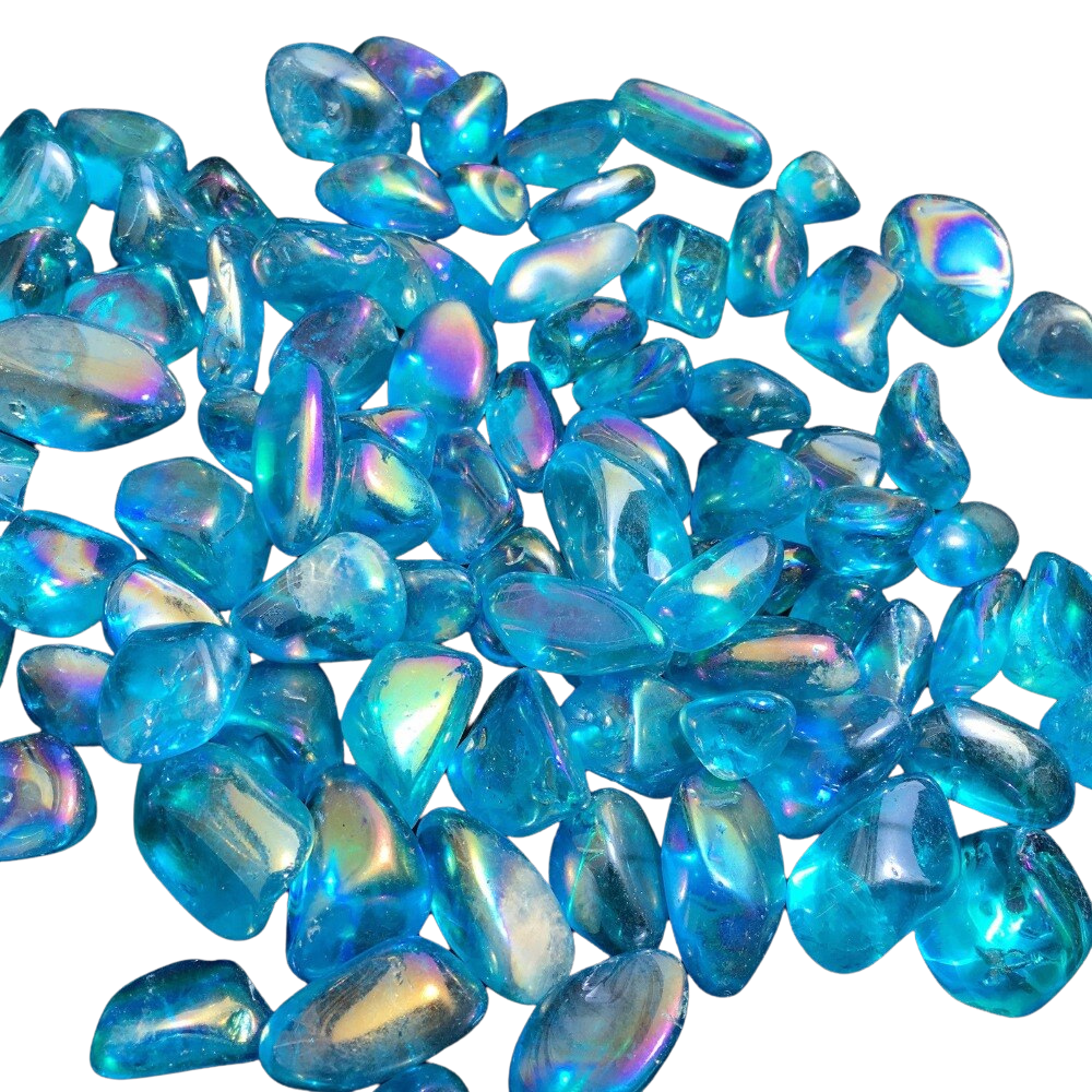 This stunning Blue Aura Quartz Tumbled Stone is a smooth, polished pocket companion that brings the calming, clarity-enhancing energy of blue aura quartz wherever you go. Tumbled to a silky-smooth finish that feels wonderful to hold, this stone showcases the mesmerizing deep blue shimmer of aura coating over natural clear quartz—displaying rich sapphire-blue iridescence with flashes of indigo and cobalt that dance across the surface like a peaceful twilight sky. Each piece is completely one-of-a-kind with unique color intensity and natural variations. The tumbling process has rounded and polished the stone's edges, creating a comfortable shape that fits perfectly in your palm, pocket, or purse. Known as the Stone of Peaceful Communication and the Stone of Spiritual Clarity, blue aura quartz combines the amplifying and clarifying properties of clear quartz with the calming, high-vibrational properties of the aura treatment, creating a powerful tool for enhancing peaceful communication, deepening meditation, clearing mental fog, and accessing spiritual wisdom. Whether carried with you for on-the-go calm and clarity, used in crystal grids, placed on your body during meditation, positioned in your space for peaceful energy, or simply kept as a beautiful reminder of tranquil spiritual connection, this blue aura quartz tumbled stone is a versatile, affordable way to work with the powerful energy of this beloved crystal.