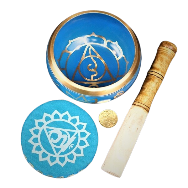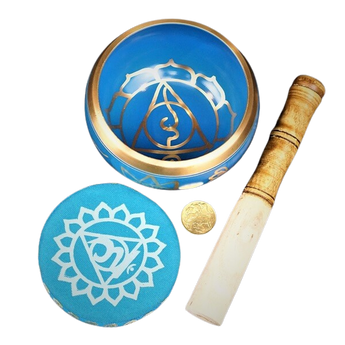 Crafted from brass with a vibrant blue finish, this Tibetan Singing Bowl is tuned to the Throat Chakra (Vishuddha) — the center of communication, authenticity, and self‑expression. When played with the included striker, it produces a clear, resonant tone that clears stagnant energy, encourages calm speech, and supports empowered expression.