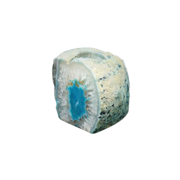 Blue Agate vibrates with the combined energies of Water and Air elements, creating a flowing, clarifying frequency that supports emotional healing and mental clarity. When illuminated by candlelight, the natural translucent layers amplify the stone's calming energy, filling your space with peaceful vibrations. Use this candle holder to create sacred ritual space, enhance meditation practices, or simply infuse your environment with tranquil, healing energy that inspires truth and gentle transformation.