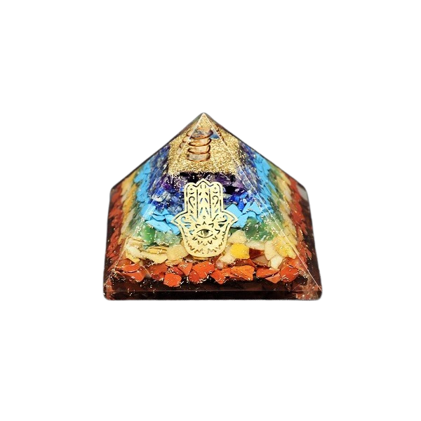 7 Chakra Orgonite Pyramid – Clear Quartz & Hamsa Hand (253g)