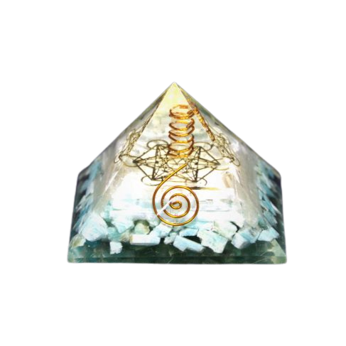 Transform negative energy into positive vibrations with this handcrafted Amazonite Orgonite Pyramid. Featuring calming Amazonite chips, amplifying Clear Quartz, cleansing Selenite, copper spirals, and the sacred Metatron Cube symbol, this pyramid continuously harmonizes energy and supports EMF protection.
