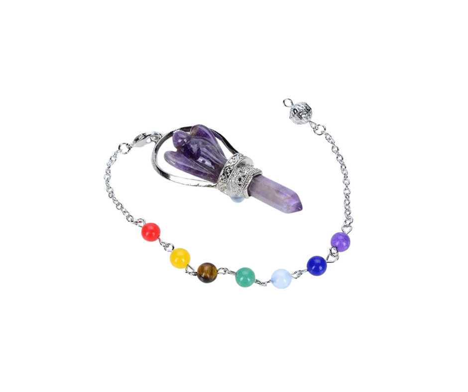 This exquisite Amethyst Angel 7 Chakra Pendulum combines the spiritual wisdom of Amethyst with the balanced energy of all seven chakra stones, creating a powerful divination tool for seekers of truth and clarity. Hand‑carved into a graceful angel form and crowned with chakra gemstones from root to crown, it provides balanced, accurate guidance while supporting chakra alignment. Complete with a velvet pouch, it’s perfect for meditation, energy healing, and spiritual practice.