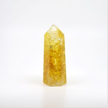 Yellow Crackle Quartz Generator Point emits a vibrant surge of optimism and clarity, infusing your environment with solar energy. Its crackled texture enhances its energetic vibration, making it a perfect stone for boosting mental clarity, self-assurance, and revitalizing your energy.