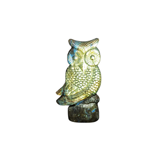 This exquisite Labradorite Owl carving combines the ancient symbol of wisdom with one of nature's most magical crystals. Known for its mesmerizing flash of iridescent blues, greens, and golds, Labradorite is a stone of transformation, intuition, and psychic protection. The owl, revered across cultures as a guardian of sacred knowledge and a guide through the darkness, makes this piece a powerful ally for those seeking to deepen their spiritual practice and trust their inner knowing.